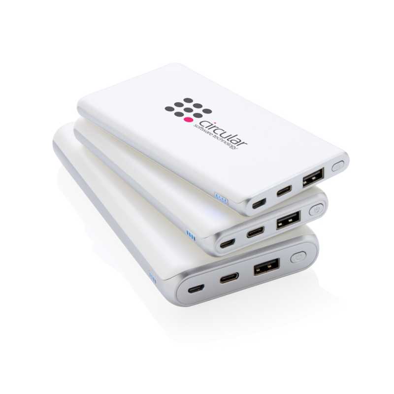 Powerbanka z ABS s kapacitou 20 000 mAh a výkonom 22,5 W na rýchle nabíjanie a bezdrôtové indukčné nabíjanie 15 W. Súčasťou je kábel USB-C a displej s indikátorom úrovne nabitia. Batéria Li-ion, 3,7 V, 74 Wh. Vstup USB-C1: 5 V/2 A, 9 V/2 A, 12 V/1,5 A; C2