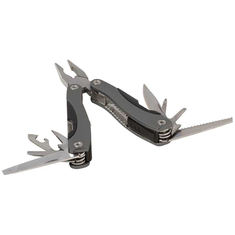 Compact stainless steel multi tool with aluminium hand grip and metallic look. 9-pieces with 13 functions: tongs, wire cutter, 3 screwdrivers, reamer, file, can opener, cap lifter, fish scraper, hook removal tool, knife and phillips screwdriver. With loc