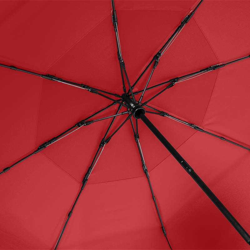 Convenient automatic open/close function for quick opening and closing, high-quality Windproof PLUS system for maximum frame flexibility in stormy conditions, flexible fibreglass ribs with coloured joints, coloured steel shaft, polyester pongee material made of recycled plastics, eco-friendly thanks to original waterSAVE cover material, with waterSAVE® label on the closing strap (with new deliveries), matt/shiny contrasting Soft-Feel handle with colour-rimmed push-button and promotional labelling option