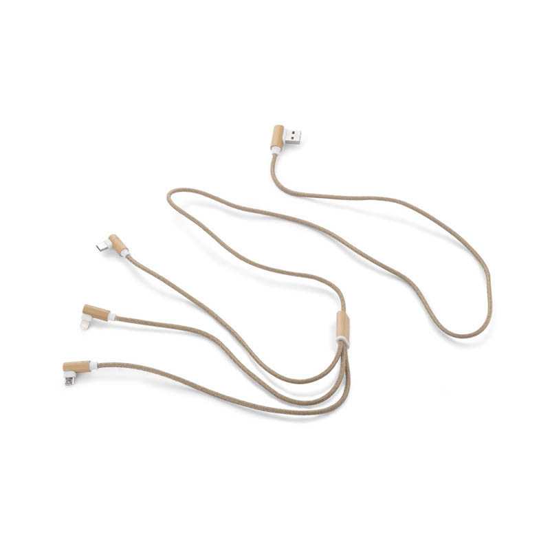 Nabíjací kábel 6 v 1 s praktickou dĺžkou 120 cm. Disponuje 5 konektormi: USB C/USB A vstup; USB C/micro USB/iOS výstup. USB C je vhodné na nabíjanie moderných telefónov, ale aj MacBookov. USB A má dvojakú funkciu (vstup aj výstup) pre nabíjanie akéhokoľvek zariadenia z akéhokoľvek iného zdroja. Puzdro a konektory sú vyrobené z FSC® čerešňového dreva, káble z RCS recyklovaného polyesteru (vonkajšia časť) a RCS recyklovaného TPE (vnútorná časť). Podiel použitého recyklovaného materiálu vzhľadom na celkovú váhu produktu: 46%. Výrobok je kompletne bez PVC. Balené v FSC® kraftovom obálkovom balení. Vhodné na nabíjanie aj prenos dát. Max 5V/2A.
