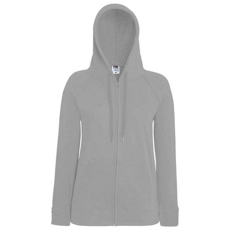 Lightweight unbrushed fleece. Raglan sleeves. Hood with self-coloured flat draw cord. Shaped side seams for a feminine fit. Two front pouch pockets. Covered zip for enhanced printability. Waist and cuff in cotton/Lycra® rib. Produced using Belcoro® yarn for a softer feel and cleaner printing process. Značka : FRUIT OF THE LOOM . Materiál : 80% bavlna Belcoro® / 20% polyester ; 24