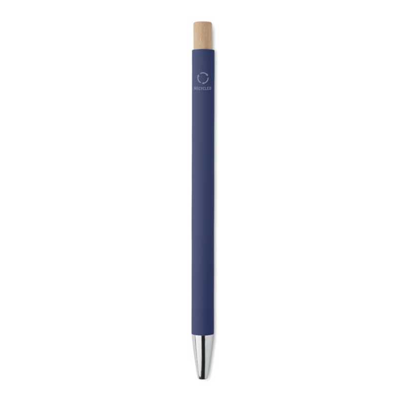 Kuličkové pero z recyklovaného hliníku s bambusovým tlačítkem. Stříbrný hrot a klip. Modrý inkoust.