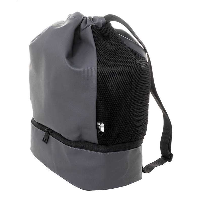 NOVINKA 2025. Prémiový vak so sťahovacou šnúrkou z RPET s priehradkou na topánky na zips, bočnými vložkami zo sieťoviny a širokými popruhmi. Polyester 600D RPET potiahnutý PU s výrazným štítkom RPET.