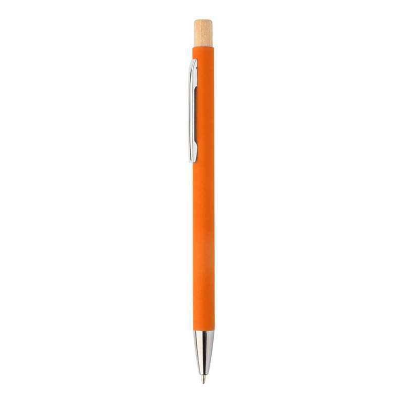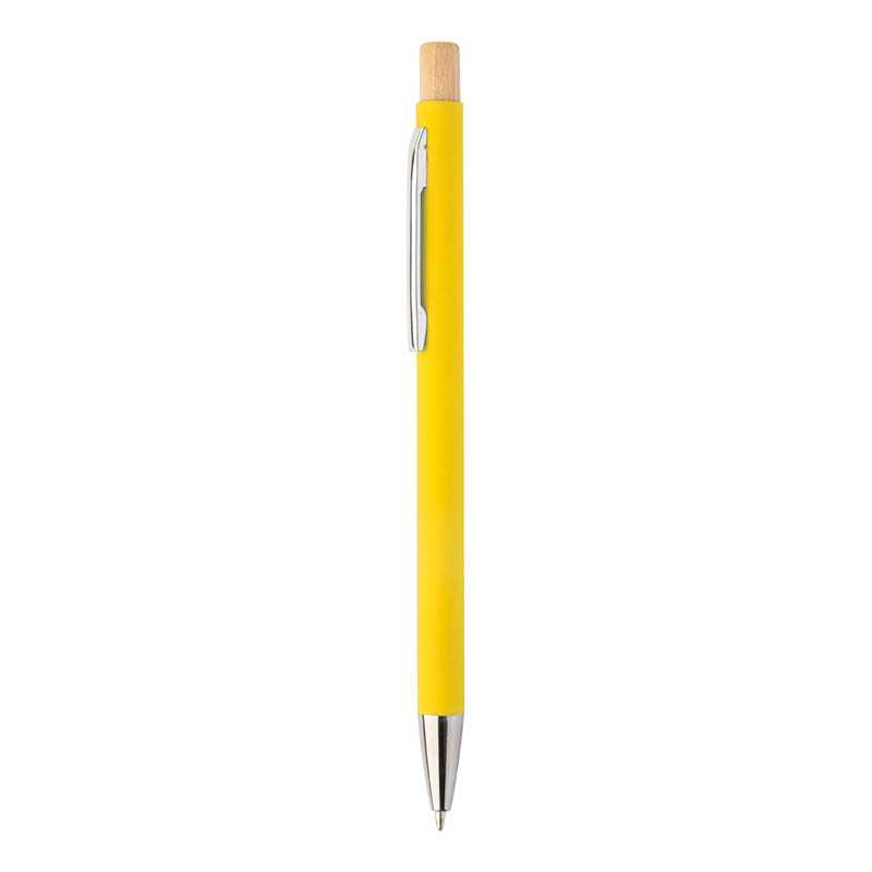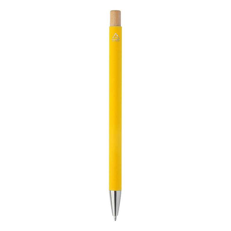 Guľôčkové pero z recyklovaného hliníka s pogumovaným povrchom a bambusovým tlačidlom a chrómovými detailmi. So špeciálnou vrstvou na zrkadlové laserové gravírovanie. S modrou náplňou.