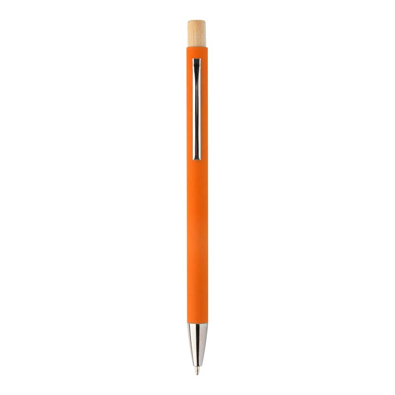 Guľôčkové pero z recyklovaného hliníka s pogumovaným povrchom a bambusovým tlačidlom a chrómovými detailmi. So špeciálnou vrstvou na zrkadlové laserové gravírovanie. S modrou náplňou.