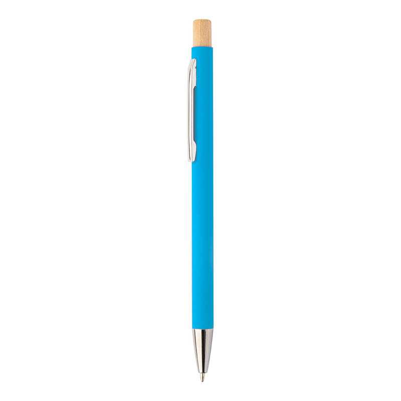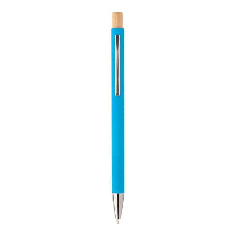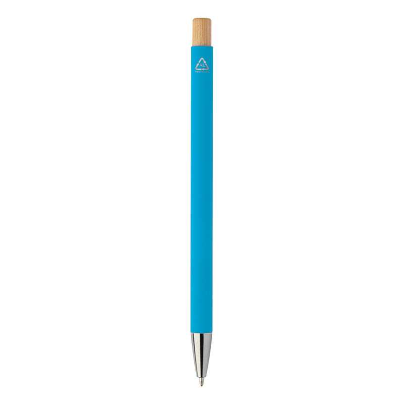 Guľôčkové pero z recyklovaného hliníka s pogumovaným povrchom a bambusovým tlačidlom a chrómovými detailmi. So špeciálnou vrstvou na zrkadlové laserové gravírovanie. S modrou náplňou.