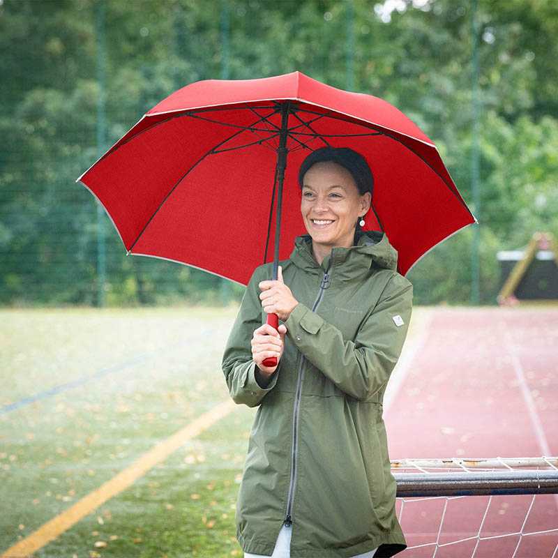 Convenient automatic function for quick opening, high-quality windproof system for maximum frame flexibility in stormy conditions, flexible fibreglass ribs, sturdy steel shaft with higher corrosion protection due to galvanisation, water and dirt repellent cover properties through original Teflon™ fabric protector, Soft-Touch handle and top