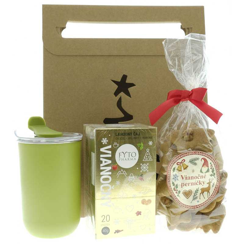 Termopohár 350ml, Vianočný čaj zlatý 40g, Perníky vykrajované 150g. Darčeková taška 30x23x10 cm