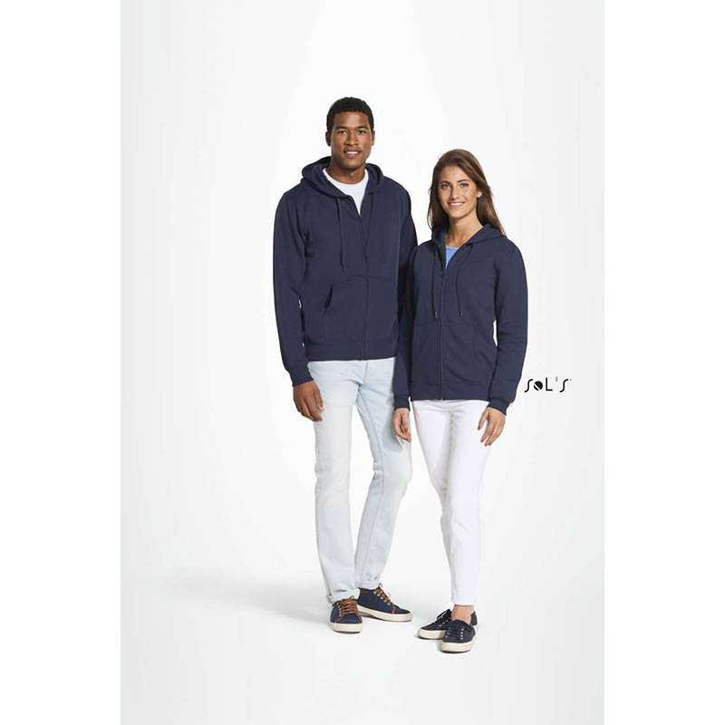 Kvalita.50 % prstencovo spriadaná bavlna – 50 % polyester.Štýl.Elastanový rebrovaný spodný okraj a manžety.Vsadené rukávy.2 klokanie vrecká.Podšitá kapucňa so sťahovacou šnúrkou tón v tóne.Skrytý zips.Rovnýs trih.Strihané a šité.