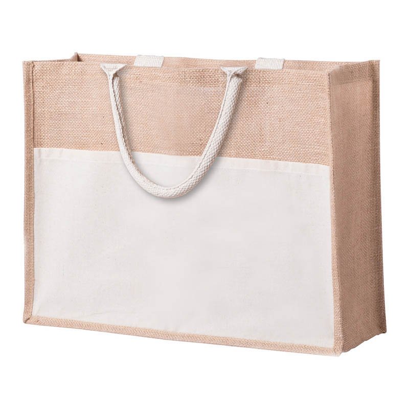 Plážová taška z laminovanej juty s bavlnenými rúčkami a predným vreckom.
