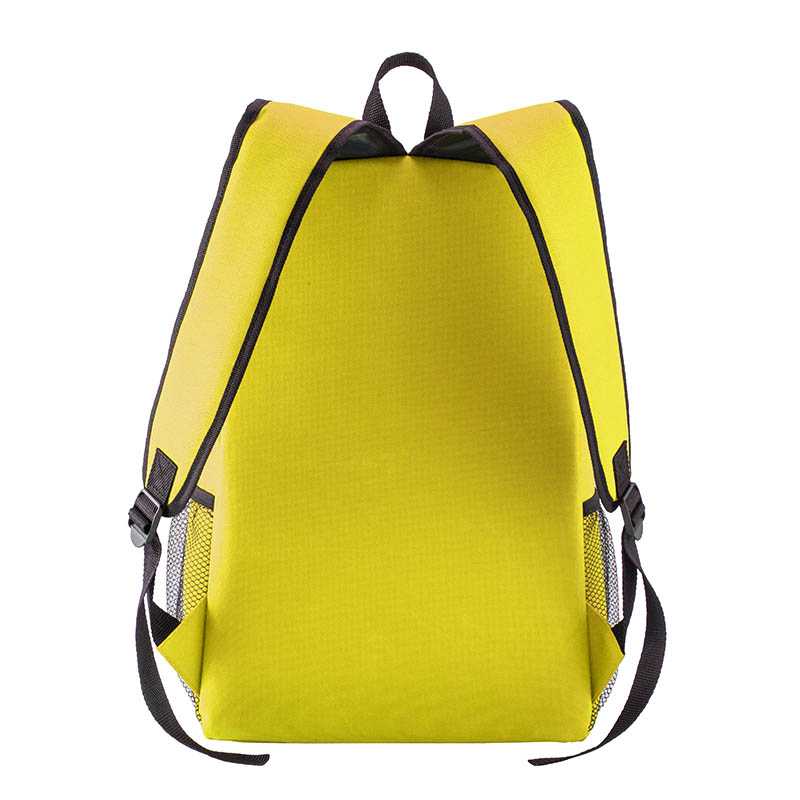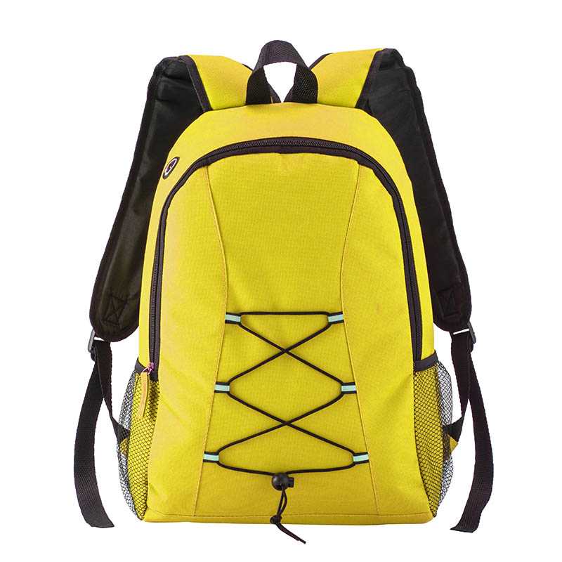 600D polyester Backpack with earbuds port. External elastic strings and 2 side mesh pockets. Padded back and shoulder straps