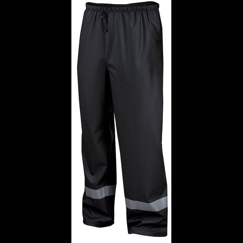Rain pants with stitched, welded and taped seams to be waterproof. Elastic waist with drawstring. Side pockets with flap to avoid water leakage and ”mesh” pocket pouch for ventilation. Reflective details on ankle cuff for increased visibility. Material: 58% PVC, 27% polyester, 15% PU Weight 320 g/m2 Size: XS-3XL