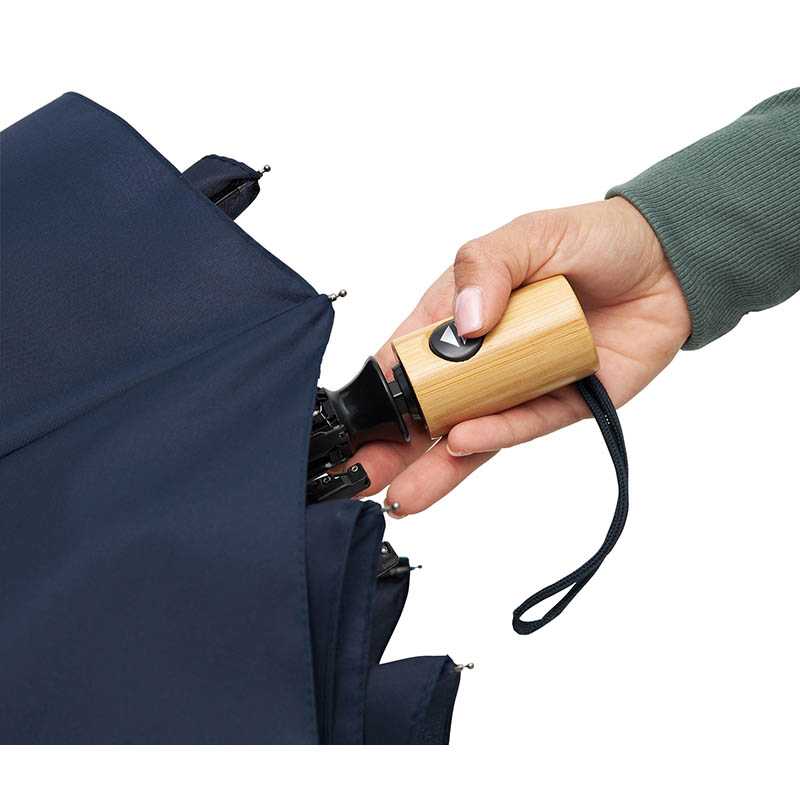 Automatic open/close windproof pocket umbrella CALYPSO with sheath in matching colour: 3-section metal shaft, with metal/plastic/fibreglass ribs and metal tips, bamboo handle with carrying loop in matching colour, polyester pongee canopy made from recycle