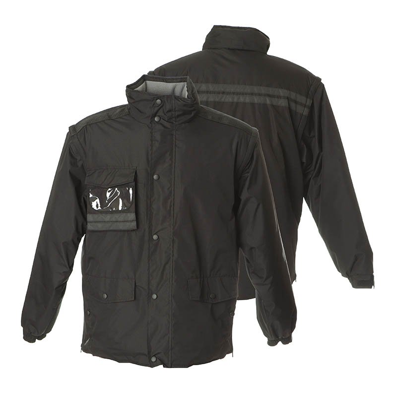 ·Outer: 230 gsm, 100% polyester (StormDri 4000) with PVC coating ·Lining: 100% polyester ·Removable inner jacket: 280 gsm, 100% polyester (fleece) in Black ·Outside jacket with double stitched taped seams ·Wind and waterproof (4,000 mm) ·Hood in collar wi