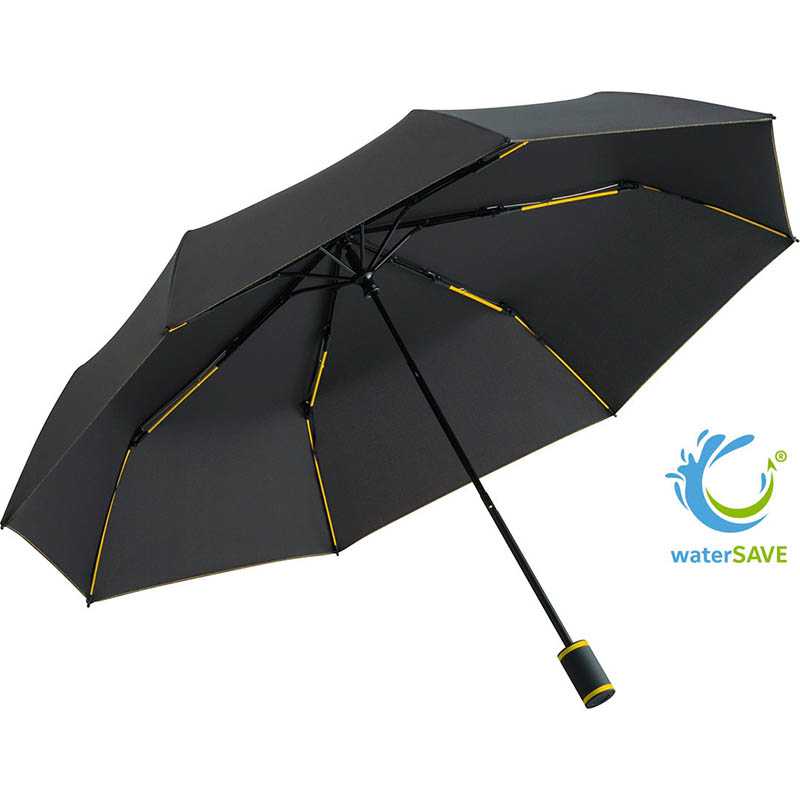 Easy handling due to safety runner, high-quality Windproof PLUS system for maximum frame flexibility in stormy conditions, flexible fibreglass ribs, polyester pongee material made of recycled plastics, eco-friendly thanks to original waterSAVE cover material, with waterSAVE® label on the closing strap (with new deliveries), attractive design thanks to coloured ribs, handle rings and seams, Soft-Feel handle with promotional labelling option, sleeve with coloured seam. Also available as mini umbrella (art. 5484, 5584), midsize umbrella (art. 4784) and as golf umbrella (art. 2384).