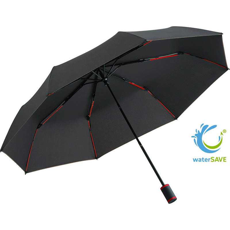 Easy handling due to safety runner, high-quality Windproof PLUS system for maximum frame flexibility in stormy conditions, flexible fibreglass ribs, polyester pongee material made of recycled plastics, eco-friendly thanks to original waterSAVE cover material, with waterSAVE® label on the closing strap (with new deliveries), attractive design thanks to coloured ribs, handle rings and seams, Soft-Feel handle with promotional labelling option, sleeve with coloured seam. Also available as mini umbrella (art. 5484, 5584), midsize umbrella (art. 4784) and as golf umbrella (art. 2384).