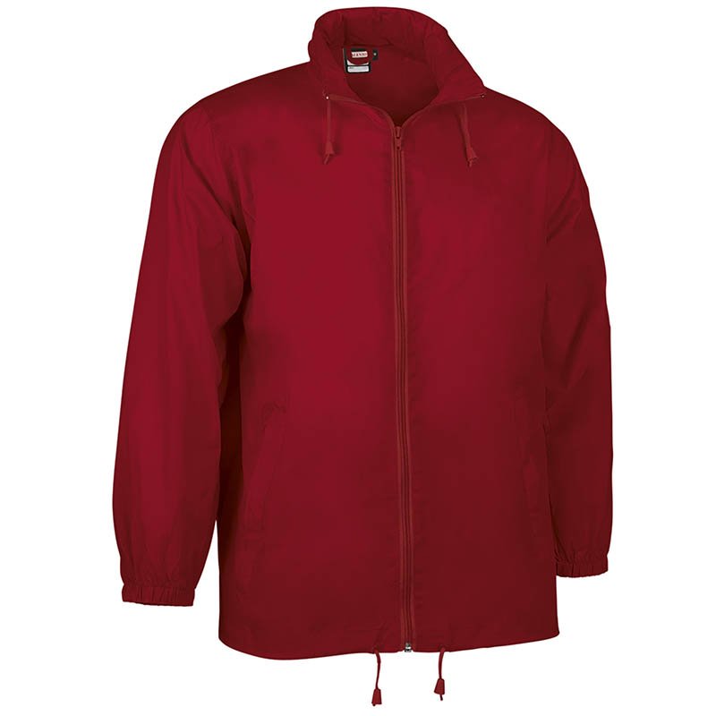 UNISEX Windbreaker. Taffeta. 100% Polyester. 70 g/m2 Water repellent Concealed hood in collar. Foldable on itself in pocket Full front zipper with puller 2 zipped side pockets To