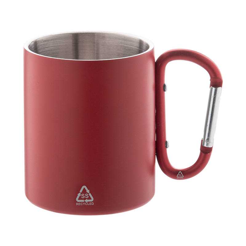 Dvojstenný termohrnček z recyklovanej nerezovej ocele s karabínou z recyklovaného hliníka v zodpovedajúcej farbe. 300 ml. V kraftovej papierovej krabici.