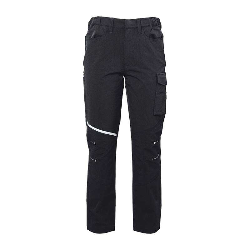 NOVINKA 2025. Stretch multi-pocket trousers - Abrasion-resistant stretch fabric 92% polyester - 8% elastan on the knees with contrasting stitching - Triple stitching - Two front zip pockets with reflective taping - A side pocket with zip - One open back pocket - A rear zip pocket with reflective taping - Double side pocket for tools or meter - Hammer hook - Elastic waistband on the hips and oversized belt loops - Keychain hook and pvc badge holder - Covered snap button at the waist
