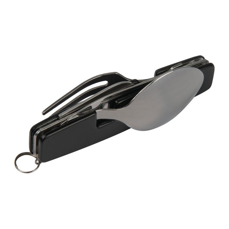 Obojstranný kempingový príbor z nerezovej ocele, jednoducho poskladateľný. V strednej časti ho môžete oddeliť, čím získate nozík a vidličku, alebo otvárač a lyžicu.