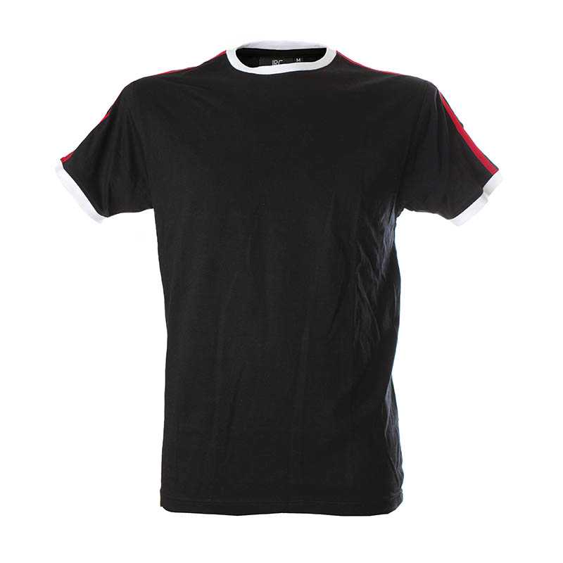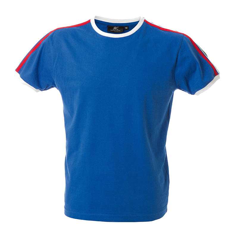 "T-shirt round neck - 100% combed cotton - Contrasting collar and cuff - Three stripes with italian colors on the shoulders - Singly sealable Značka : JAMES ROSS . Materiál : 100% bavlna
