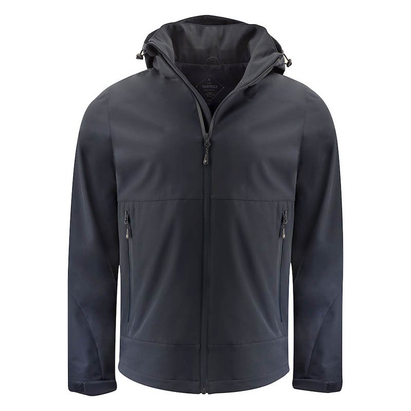 Wind and water repellent softshell jacket. Reversed waterproof zipper at center front and side pockets. Inner pocket with zipper on the left side. Detachable hood. Adjustable velcro closure at bottom sleeves. Hood and seam are adjustable with elastic cords. Hidden embroidery zipper on the inside. Fabrics: Shell: 96% polyester, 4% elastane, 285 g/m2, bonded with 100% polyester birds eye, WP 3000/MVP 3000. Lining: 100% polyester (sleeves) + 100% polyester mesh (body) Size: S-3XL