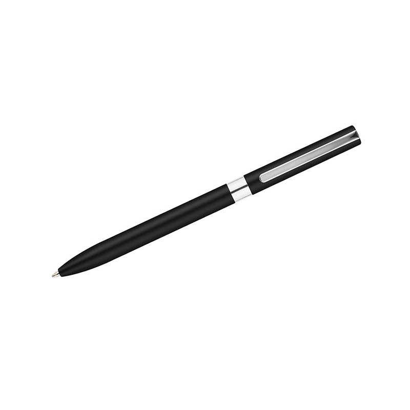 NOVINKA 2025. Alexluca ball pen with twist mechanism and smooth metal body in an elegant black color. Clip and design tip in matching color. Presented in an individual black box with the brand logo. Blue ink.