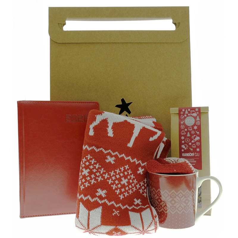 Darčeková taška stredná > prírodná > 40x28x10 cm, Vianočný šál > červená, Vianočná sada - hrnček a rukavice > červená, Vianočný čaj 100 g, Diár (Elegant 2026) - 15x21x2,4 cm > červená > denný A5
