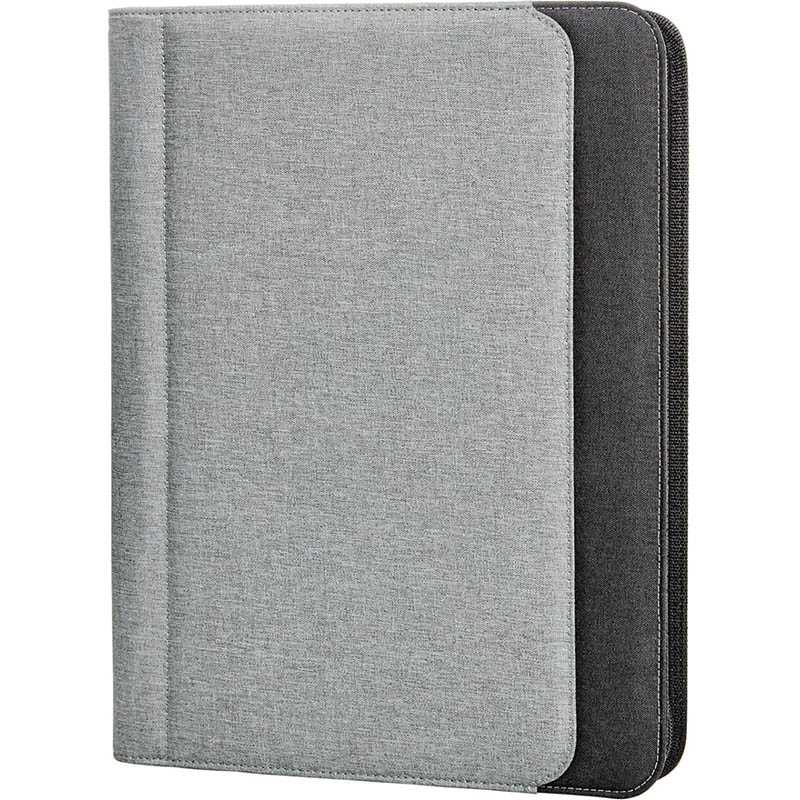 Zakladač na dokumenty z PU kože s 5000 mAh power bankou, 20 listovým blokom a stojanom na tablet. Vrátane USB nabíjacieho kábla.
