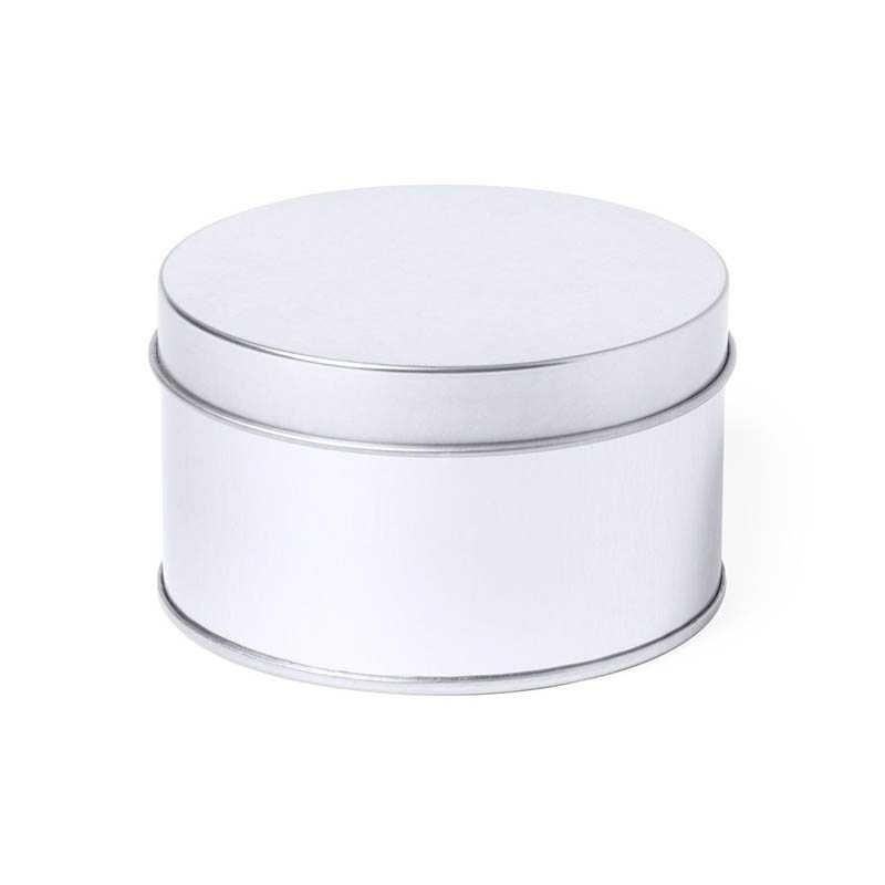 NOVINKA 2025. Presentation box in round format, made in resistant metal with silver finish and matching lid.