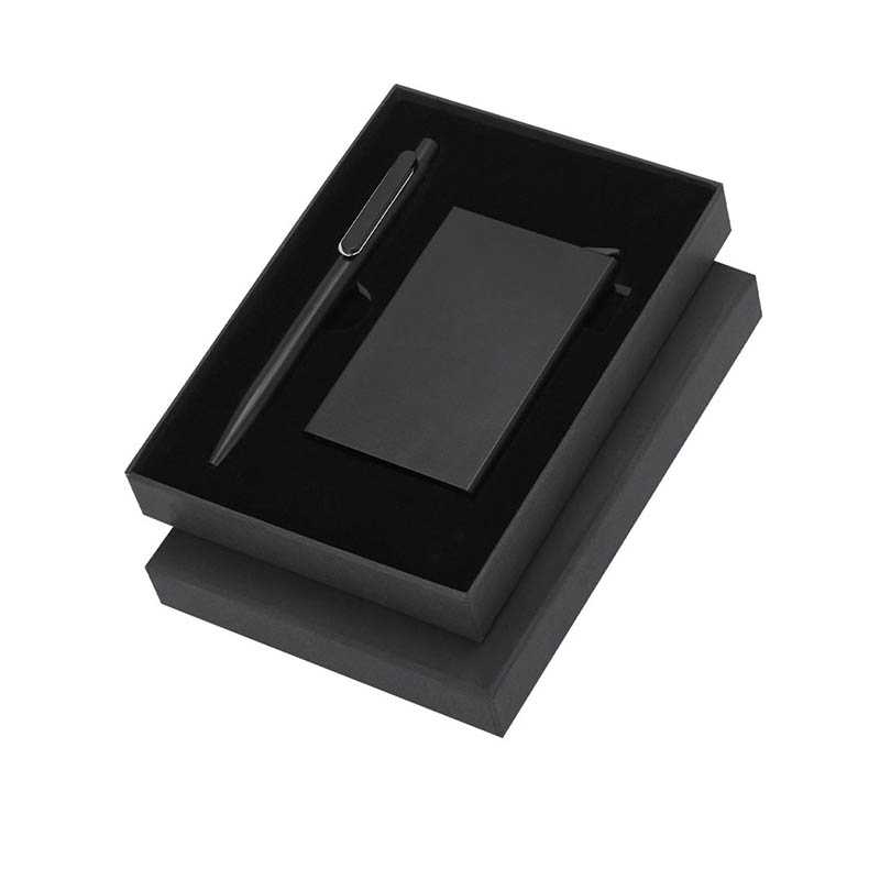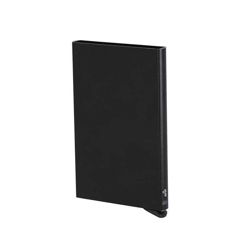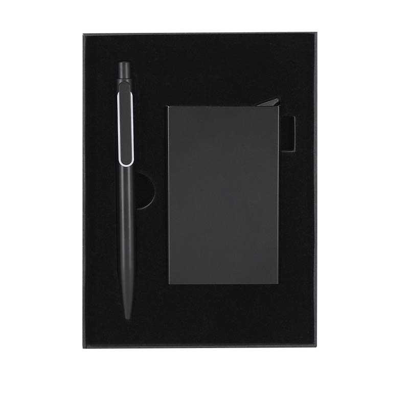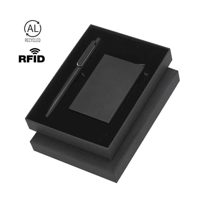 NOVINKA 2025. Set of pen and cardholder made from Recycled Aluminum.The set includes:- Matte black ballpoint pen made from Recycled Aluminum with a push mechanism, clip, and decorative metal element.- Cardholder in black made from Recycled Aluminum suitable for 6 RFID cards, with a push mechanism to extract the cards.Both have the Recycled Aluminum logo engraved and are presented in an elegant black box with an interior insert.Recycled Aluminum is a material with almost infinite recycling possibilities, without losing its original properties and consuming less energy in this process.GRS Certification (Global Recycled Standard), which guarantees the recycled origin of the material used to manufacture the product.