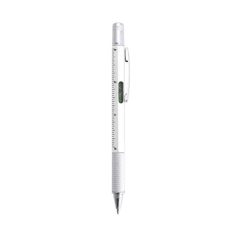 Mutltifunctional ABS ballpen with twist action mechanism. Including: a level, ruler, and rubber tip for capacitive screens. Black ink.