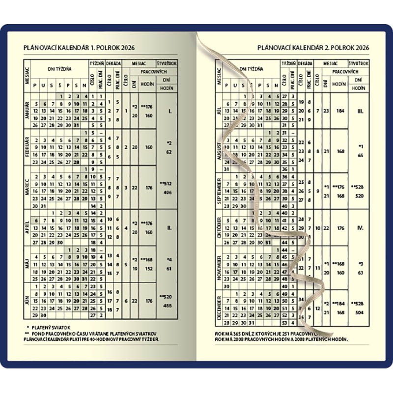 Osemnásťmesačný diár obsahuje prehľad na rok 2025 a 2026, zoznam českých a slovenských mien, česko-slovenské týždenné riadkové kalendárium s menami a sviatkami a priestor na poznámky. Kalendárium začína v júli 2025 a končí v decembri 2026.Rozsah: 192 strán. Rozmer: 11 x 17 x 2 cm. Hmotnosť: 0,2. Papier: 80 g/m2. Väzba: tuhá knižná. Kalendárium: týždenné 18 mesačné 2 jazyčné (CZ, SK).