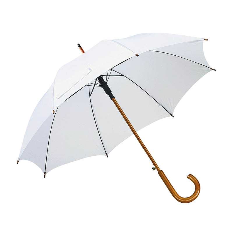Dáždnik s automatickým otváraním, dreveným držadlom a s drevenou zakrivenou rúčkou v rôznych farbách.