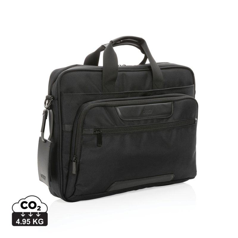 Elegantná skvele vybavená taška pre každodenné cestovanie. Vyrobená z pevného recyklovaného polyesteru 1680D s bohatými detailmi z umelej kože a množstvom vreciek. Priestranný hlavný oddiel, polstrovanýoddiel na 15,6" notebook, dodatočné menšie vrecko na zips. USB výstup pre nabíjanie telefónu na cestách, vrecká s RFID ochranou, pútka na perá, postranné vrecko na fľašu a odnímateľný kontaktný štítok. Zloženie: vonkajšia časť: 100% 1680D recyklovaný polyester; vnútorná časť (podšívka): 150D recyklovaný polyester. Vrátane skenovateľnej zložky AWARE ™ garantujúcej obsah recyklátu. Na výrobu bolo využité 36,66 500ml PET fliaš. Z výťažku každého predaného produktu prispievame 2% na podporu iniciatívy Water.org.