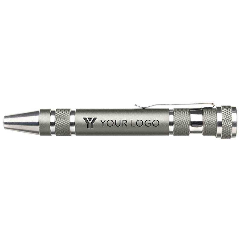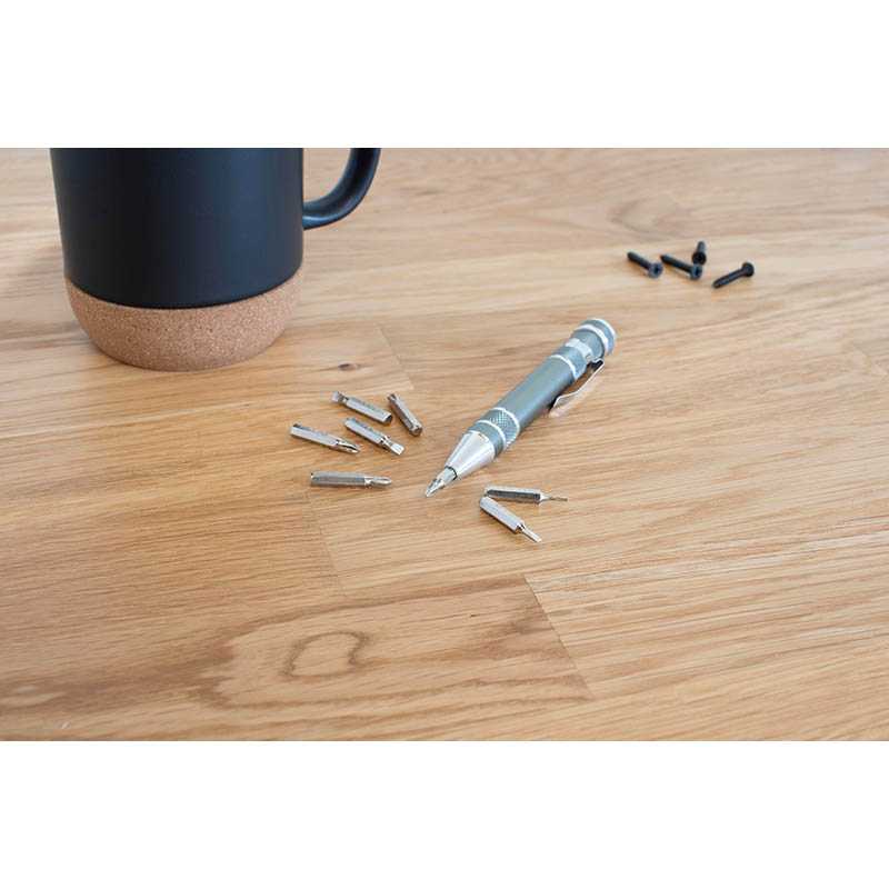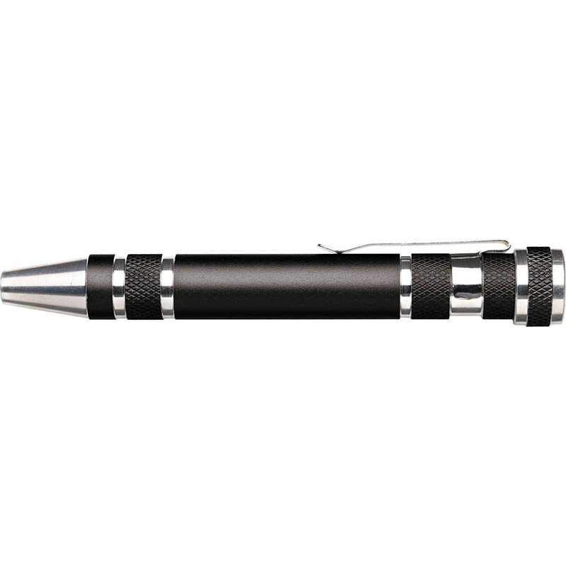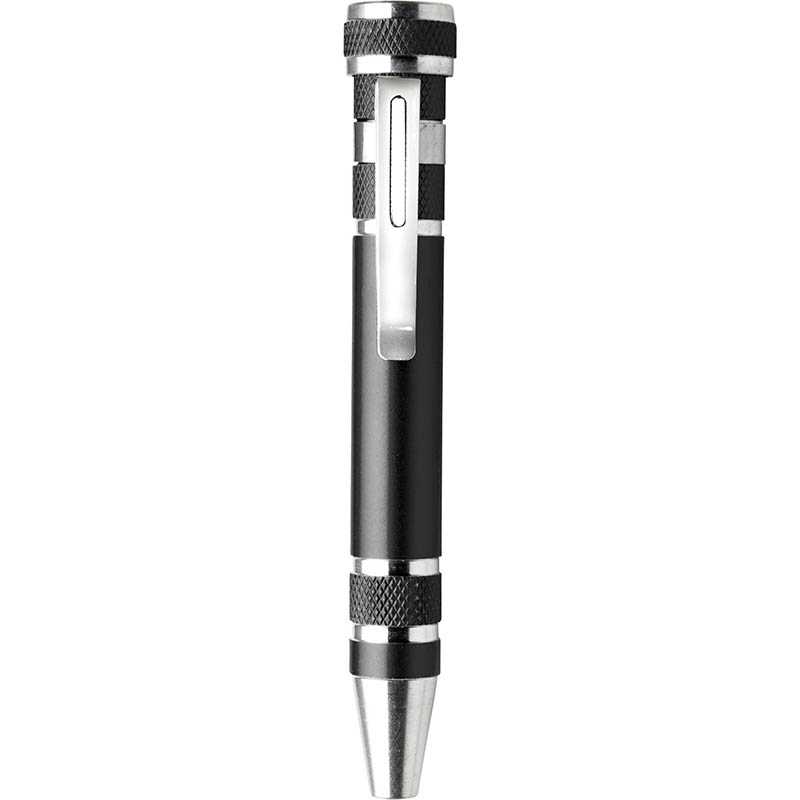 Steel pen-shaped pocket screwdriver. Including: four flat-head and four cross-head screwdriver bits.