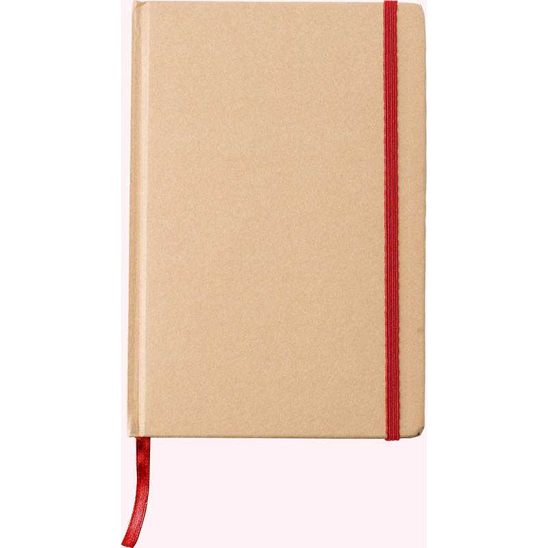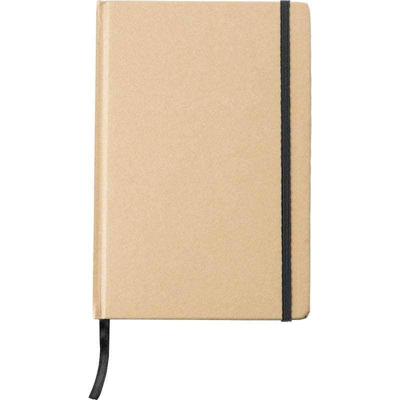 Recycled carton notebook (A5) with 160 lined pages. With elastic to keep closed and a ribbon bookmark.