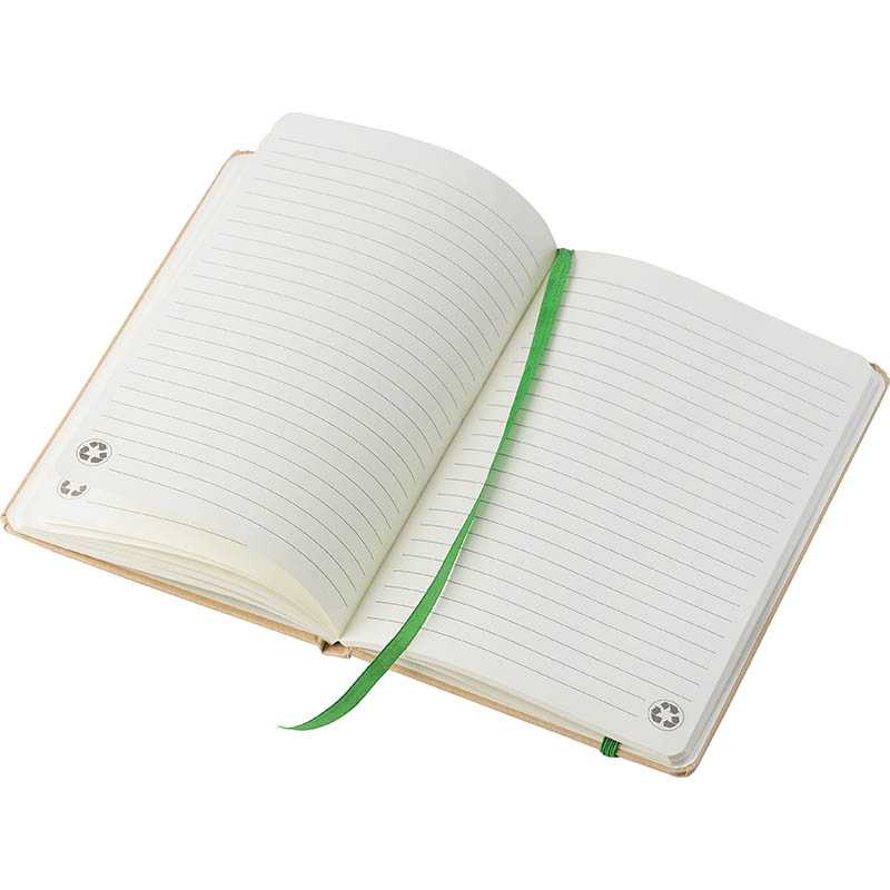 Zápisník formátu A5 s deskami ze 40 % recyklovaného PU a 60 % PU. 160 linkovaných stran (80 listů) recyklovaného 70g papíru. Ladící záložka z polyesteru.