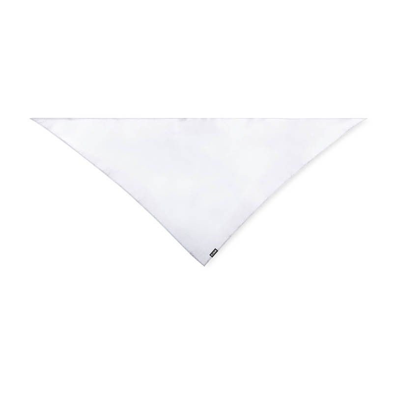 NOVINKA 2025. Extra large size bandana with tirangular design made of 190T RPET. With body in soft Recycled polyester, with bright and varied colours. Distinctive label and reinforced stitching on the sides. White colour specially designed for sublimation printing.The RPET material is made from recycled plastic to encourage the reuse of plastic waste and help the sustainability of the planet.