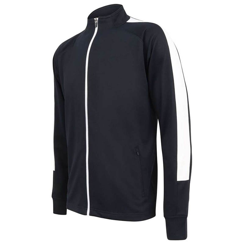 100 % polyester Interlock.Panely na vonkajších rukávoch v kontrastnej farbe.Stredový predný zips v kontrastnej farbe.Bočné vrecká na zips.Rolákový golier.1 x 1 rebrované manžety.Poloautomatické jazdce na všetkých zipsoch.