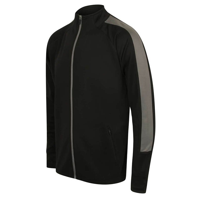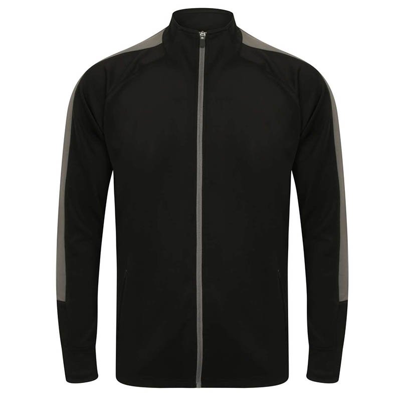 100 % polyester Interlock.Panely na vonkajších rukávoch v kontrastnej farbe.Stredový predný zips v kontrastnej farbe.Bočné vrecká na zips.Rolákový golier.1 x 1 rebrované manžety.Poloautomatické jazdce na všetkých zipsoch.