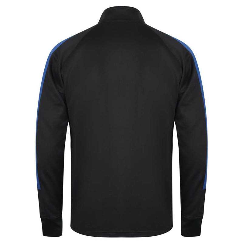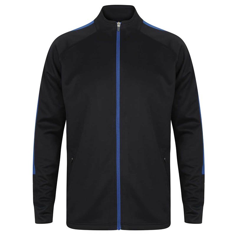 100 % polyester Interlock.Panely na vonkajších rukávoch v kontrastnej farbe.Stredový predný zips v kontrastnej farbe.Bočné vrecká na zips.Rolákový golier.1 x 1 rebrované manžety.Poloautomatické jazdce na všetkých zipsoch.