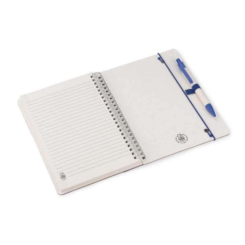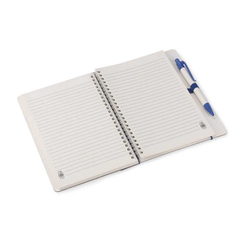 Zápisník A5 z 60% recyklovaného polyesteru a 40% PU. 256 linkovaných stran (128 listů) z recyklovaného 70g papíru. Dvě záložky z polyesterové stuhy.