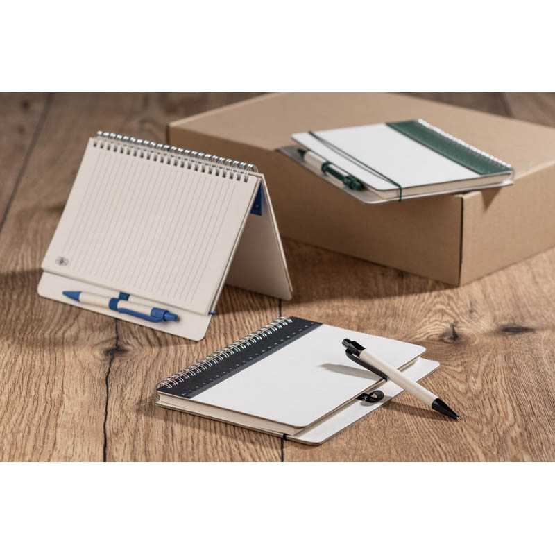 Zápisník a pero REGALI jsou vyrobeny z kartonů od mléka. Pero má modrou náplň. Zápisník je dodáván s 20 cm dlouhým pravítkem, které odpovídá barvě povrchové úpravy na peru. Guma na pero a jedna, která uzavírá zápisník v barvě povrchové úpravy pera.