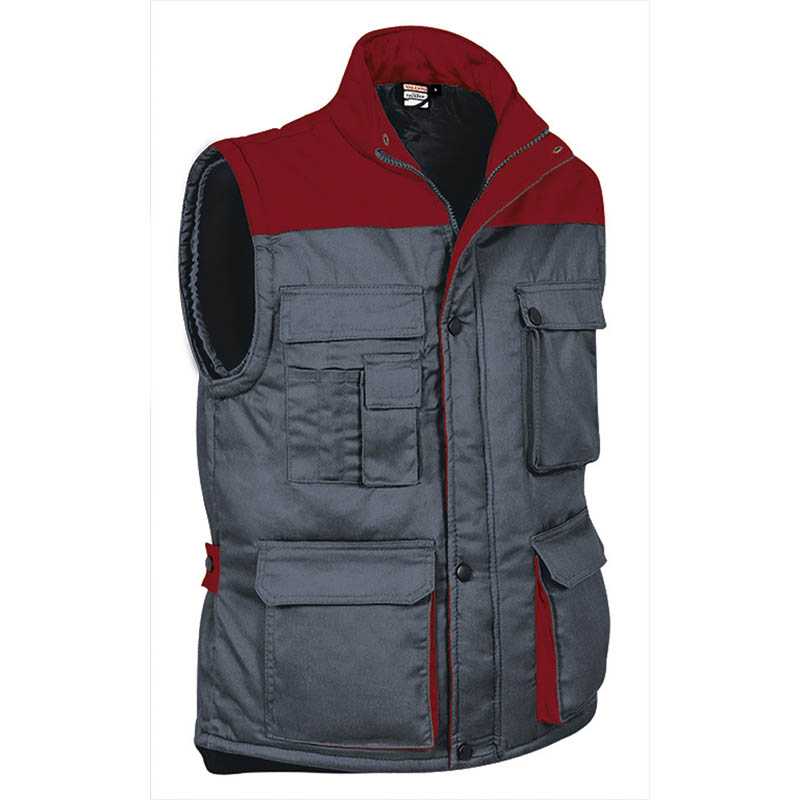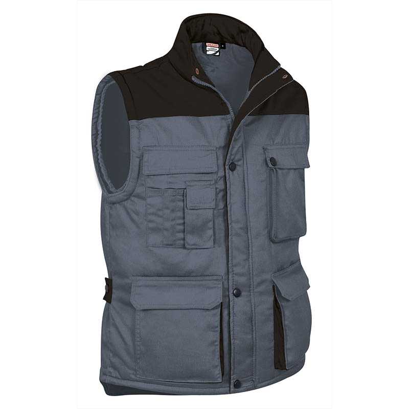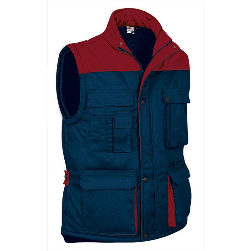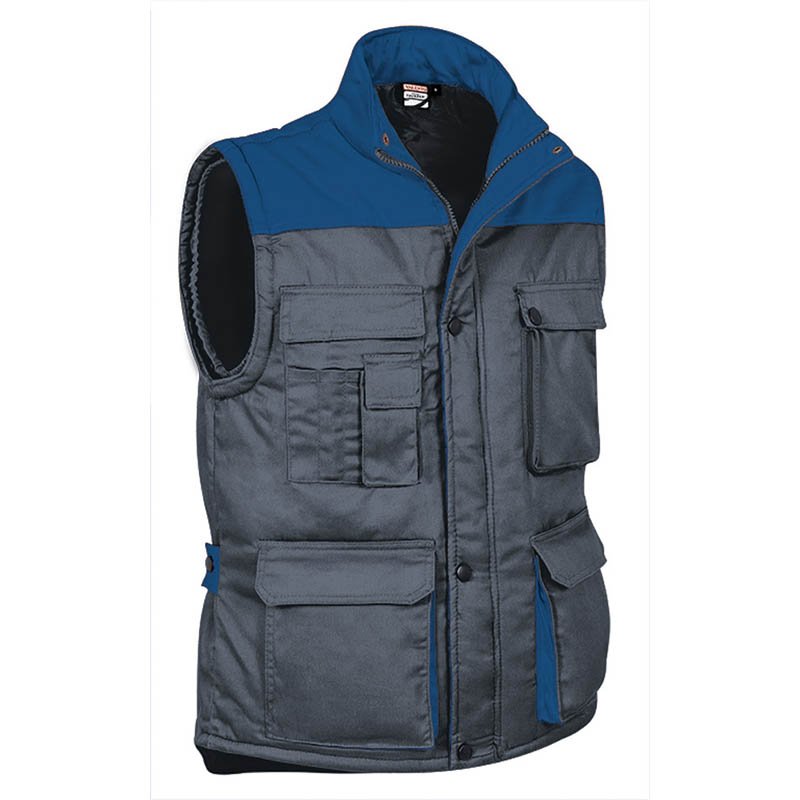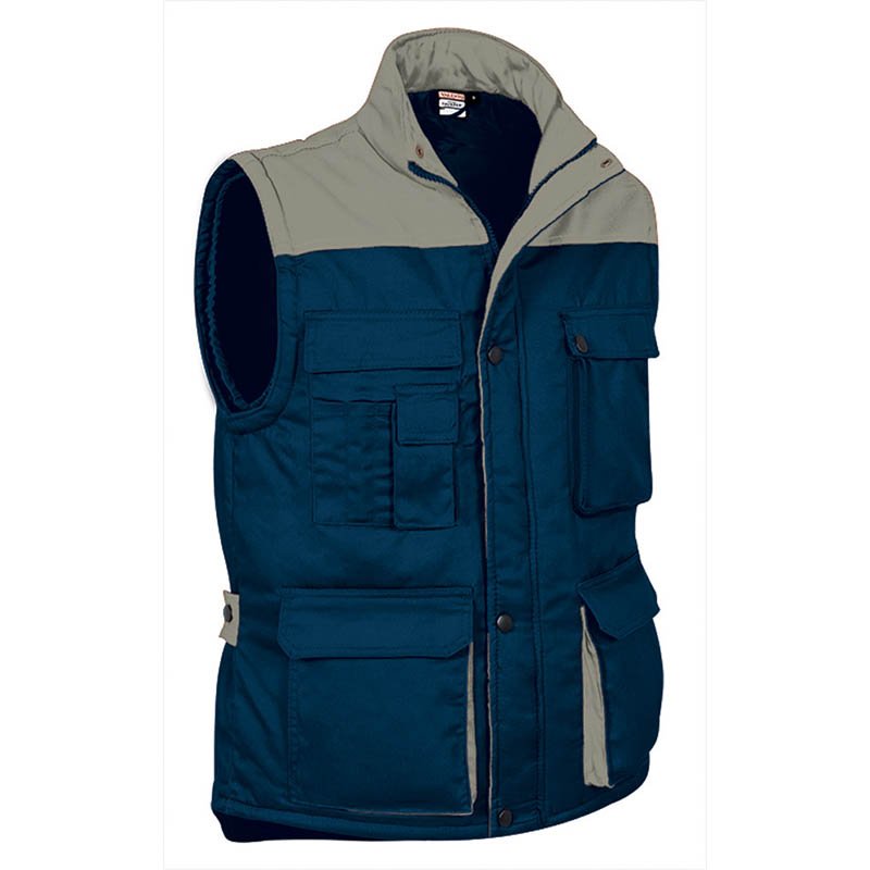 Two-Tone Padded Multi-Pocket Work Vest. Made of a sturdy cotton twill fabric blended with polyester outer fabric for strength and durability, smooth inner lining and inner quilting for ensuring excellent thermal insulation. Stand-up collar with full-zip flap and snap matching button front closure, which provides warmth and comfort. Elasticated waistband and armholes for a secure and comfortable fit, adjustable waist with side button fastening for a better fit, a tailpiece that covers the lumbar zone for added comfort and also provides a large printing area.Two lower gusseted pockets, two side pockets, two upper pockets (with a zip on the left for easy customization), three pen holders, a small accessory pocket and an inner velcro pocket, for a secure and convenient storage. Includes an inside back zip for easy marking with different methods: screen printing, embroidery, transfer printing, badges, shields, vinyl application. Ideal as workwear and uniforms, this Vest matches all THUNDER line items (sweatshirt, trousers, T-shirt, polo shirts, fleece jacket, and softshell jacket).