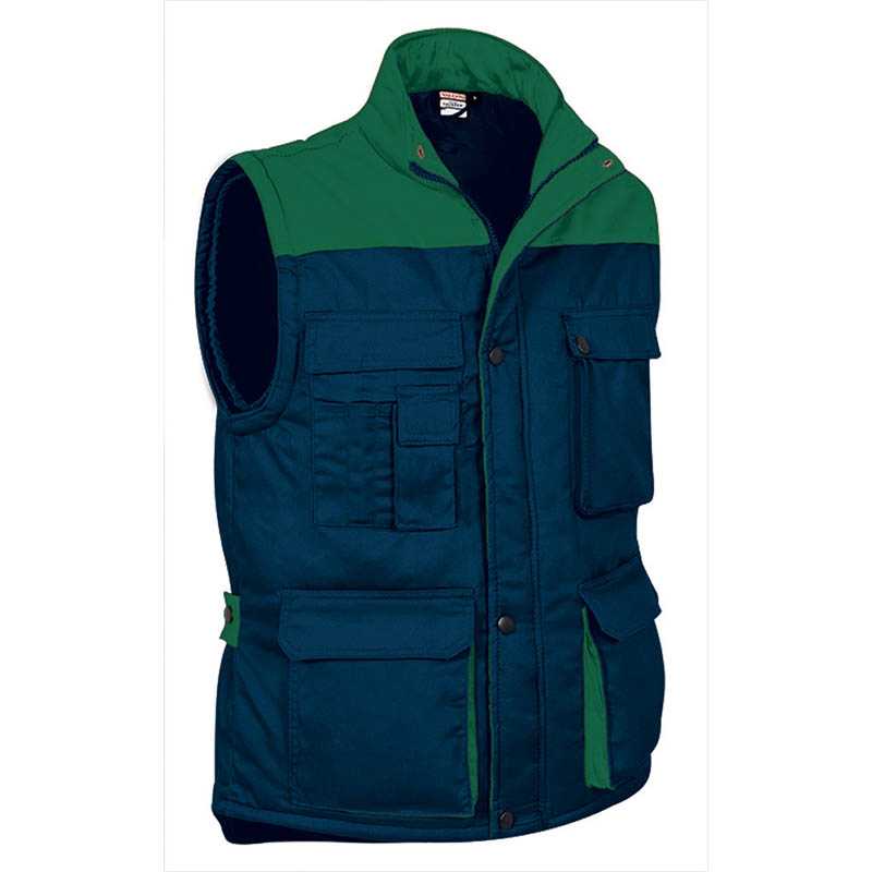Two-Tone Padded Multi-Pocket Work Vest. Made of a sturdy cotton twill fabric blended with polyester outer fabric for strength and durability, smooth inner lining and inner quilting for ensuring excellent thermal insulation. Stand-up collar with full-zip flap and snap matching button front closure, which provides warmth and comfort. Elasticated waistband and armholes for a secure and comfortable fit, adjustable waist with side button fastening for a better fit, a tailpiece that covers the lumbar zone for added comfort and also provides a large printing area.Two lower gusseted pockets, two side pockets, two upper pockets (with a zip on the left for easy customization), three pen holders, a small accessory pocket and an inner velcro pocket, for a secure and convenient storage. Includes an inside back zip for easy marking with different methods: screen printing, embroidery, transfer printing, badges, shields, vinyl application. Ideal as workwear and uniforms, this Vest matches all THUNDER line items (sweatshirt, trousers, T-shirt, polo shirts, fleece jacket, and softshell jacket).