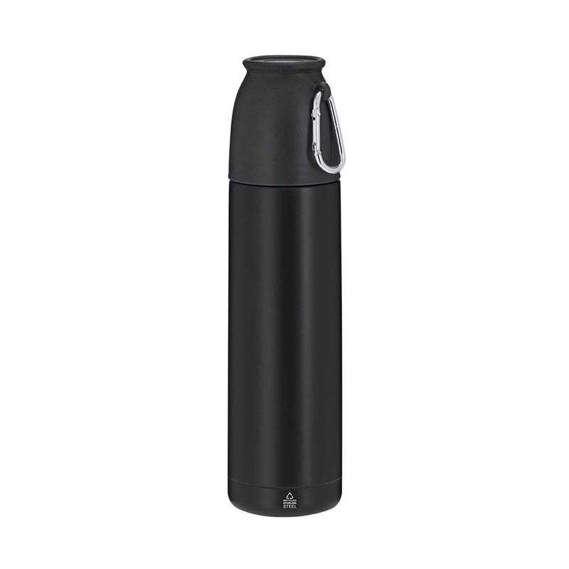 NOVINKA 2025. Thermal set with cup made of Recycled Stainless Steel. 500 ml capacity thermos with double wall, ensuring better and longer temperature preservation, with safety dispenser. 120ml cup, adjustable via screw and with practical transport carabiner. Thermos and cup in matching matte finish, ideal for enjoying beverages, whether hot or cold, anytime and anywhere. With Recycled Stainless Steel label.Steel is one of the most demanded materials that can be found almost everywhere, from everyday products to large constructions. With countless properties, including durability and high degree of reusability, making it a highly valued alternative in sustainability solutions. Properly treated, it allows obtaining new resources for infinite use.
