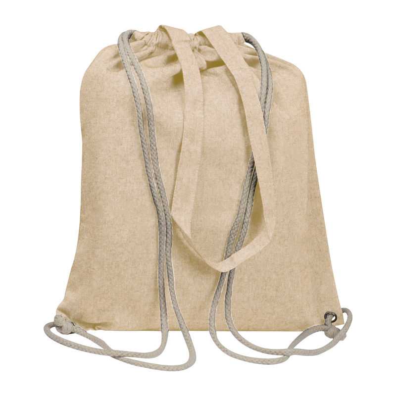 Batoh se stahovací šňůrkou z recyklované předspotřební bavlny (70 %) a RPET (30 %). 140 gr/m2. Tato položka se po otisku může zmenšit.
