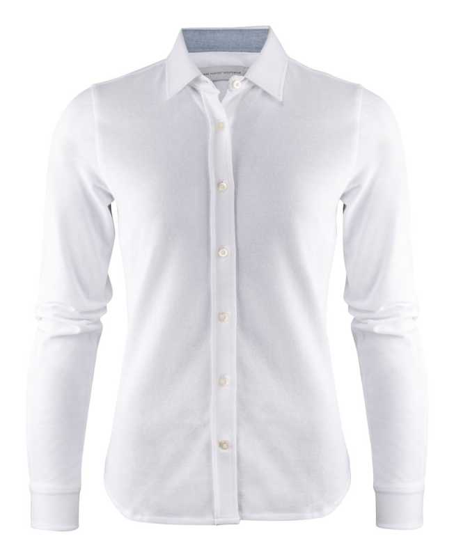 Product Name: Burlingham Woman Item Number: 2123028 Product Fabrics: 60% cotton/40% polyester , 165 g/m2 Description: Oxford look jersey shirt. Woven details inside collar and side slits. Button down collar, adjustable cuffs and mother of pearl like buttons. Colours: 501 light blue / white, 601 navy / white, 901 black / white