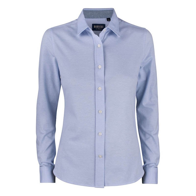Product Name: Burlingham Woman Item Number: 2123028 Product Fabrics: 60% cotton/40% polyester , 165 g/m2 Description: Oxford look jersey shirt. Woven details inside collar and side slits. Button down collar, adjustable cuffs and mother of pearl like buttons. Colours: 501 light blue / white, 601 navy / white, 901 black / white